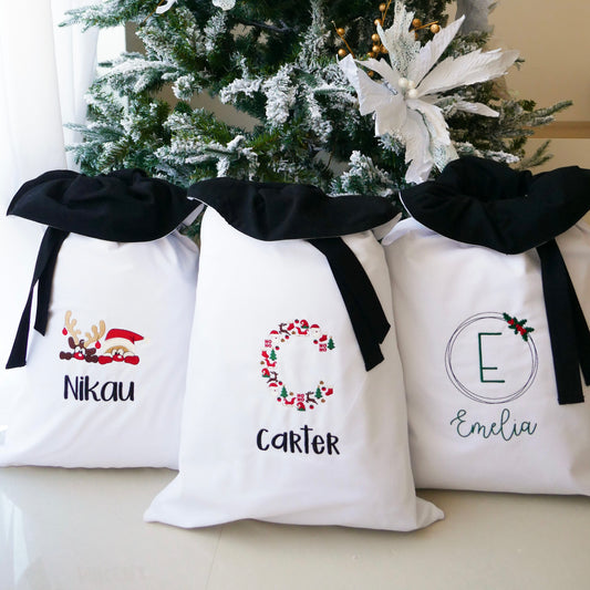 Large Santa sacks personalised with machine embroidery for quality that will last.
