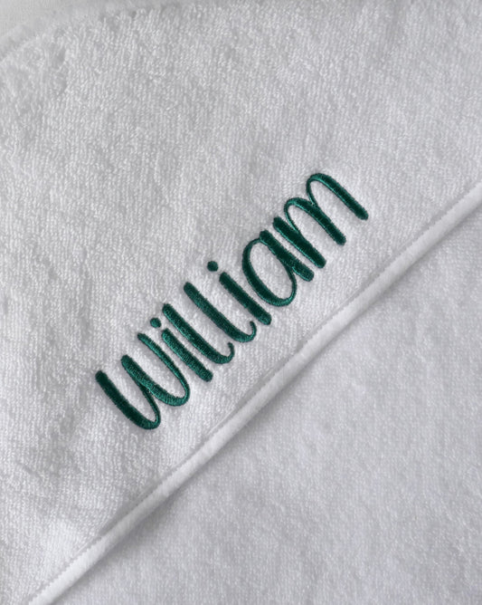 Luxurious 100% cotton bath towels personalised with machine embroidery.